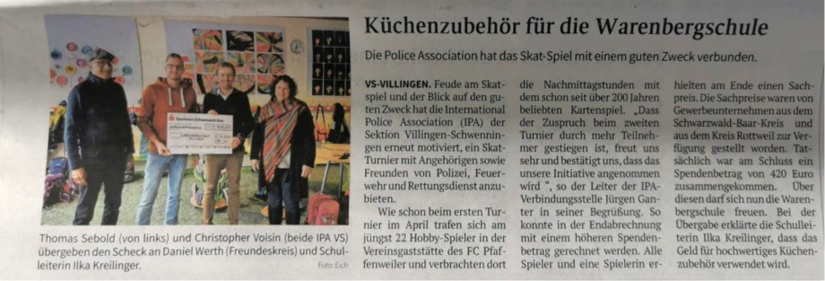 Dass sich Angehörige von Polizei, Feuerwehren, Rettungsdiensten oder des Technischen Hilfswerks auch mal außerhalb von Unfällen oder anderen Unglücken treffen und sich dann in entspannter Runde austauschen können, war die grundlegende Idee der International Police Association (IPA) der Verbindungsstelle Villingen-Schwenningen. Gemäß dem IPA-Leitspruch „servo per amikeco“ organisierte das IPA-Team am 22. April 2023 ein Skatturnier im Fußballsportheim in Pfaffenweiler. Örtliche Firmen aus Villingen-Schwenningen hatten im Vorfeld die Veranstaltung durch gespendete Sachpreise unterstützt.