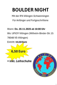 Am Donnerstag, 20.11.2025, veranstalteten wir wieder eine Bouldernight im UPJOY Villingen. Die Veranstaltung wird wohl immer beliebter bei unseren jungen Mitgliedern, es waren wieder viele kletterbegeisterte Kolleginnen und Kollegen dabei.