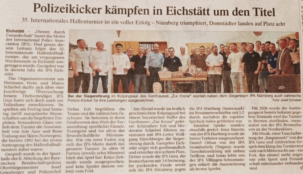 Vom 28.-30.11.2025 veranstaltete die IPA Eichstätt das 35. Internationale Hallenfußballturnier, welches wir im Jahr 2019 ausgerichtet hatten. Trotz krankheits- und verletzungsbedingten Absagen konnten wir noch 8 Spieler aufbieten, so dass wir mit insgesamt 11 Personen ins schöne Eichstätt gefahren sind. Untergebracht waren (fast) alle Mannschaften im Hotel "Das Altmühltal", strategisch günstig direkt in der Alstadt gelegen.